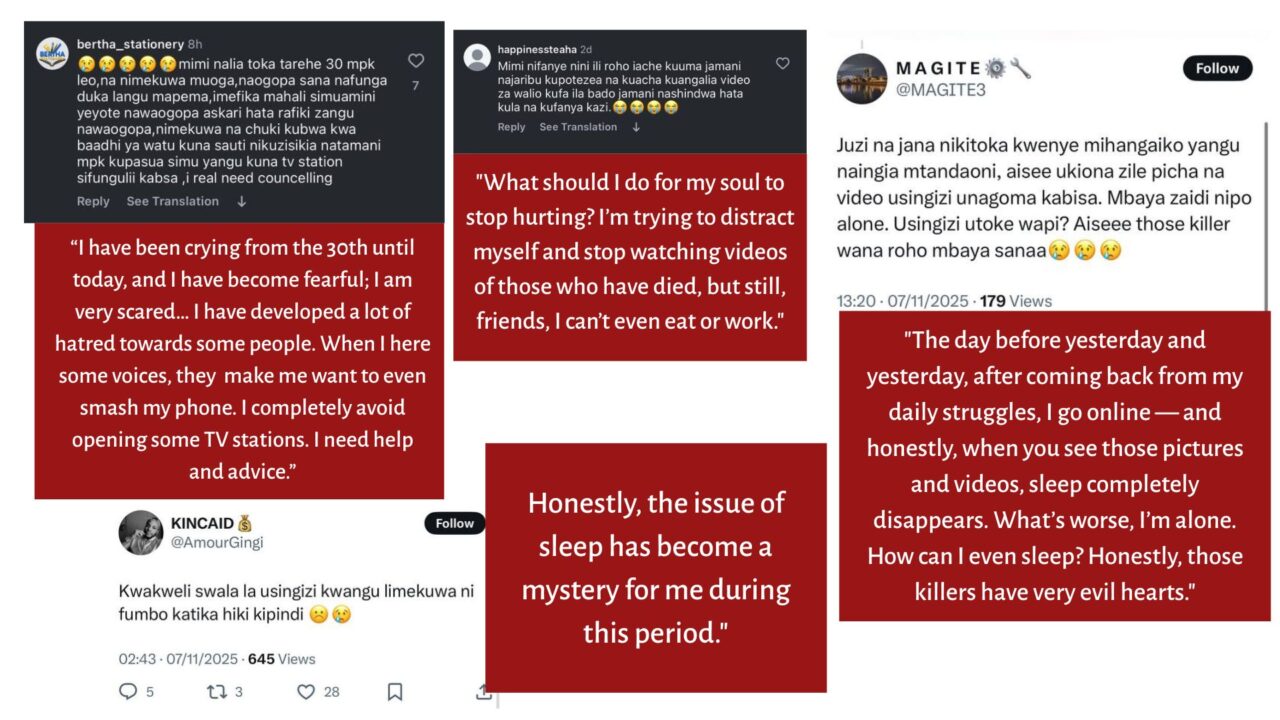“I thought it was only me. Honestly, sleep has become such a struggle. The moment I fall asleep, scenes of killings fill my mind,” one X user complained. “What should I do so that my soul stops hurting, honestly? I try to distract myself and avoid watching videos of the dead, but still, I can’t even eat or work,” explained another social media user on Instagram.