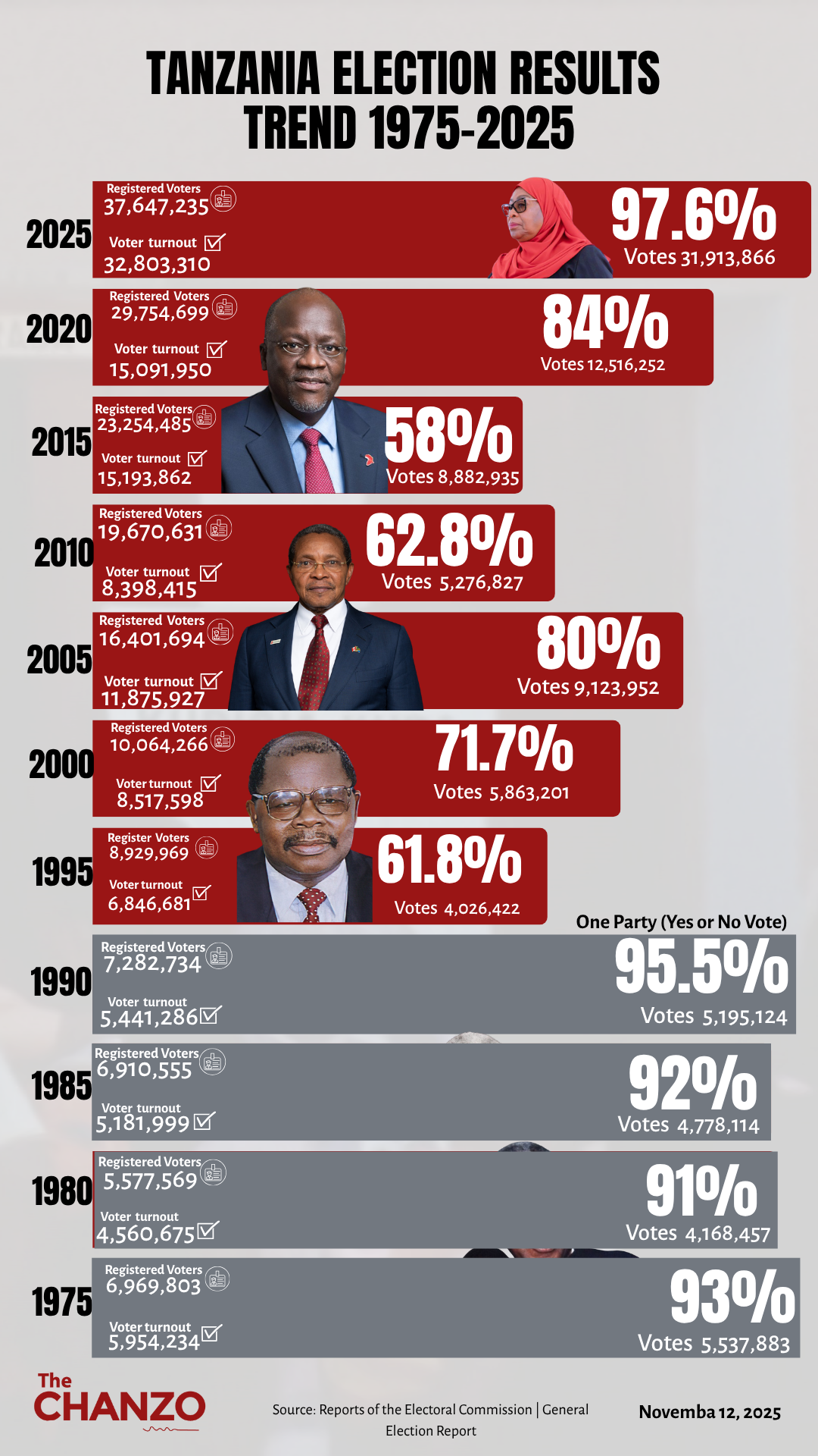 The 2025 election recorded one of the highest voter turnouts in Tanzania’s history, reaching 87 percent. According to the November 2022 census, the number of people aged 15 and above in Tanzania was 35,341,131. Based on these figures, the voting statistics indicate that approximately 92.5 percent of Tanzania’s adult population went out and voted on October 29, 2025, a historic statistical feat.