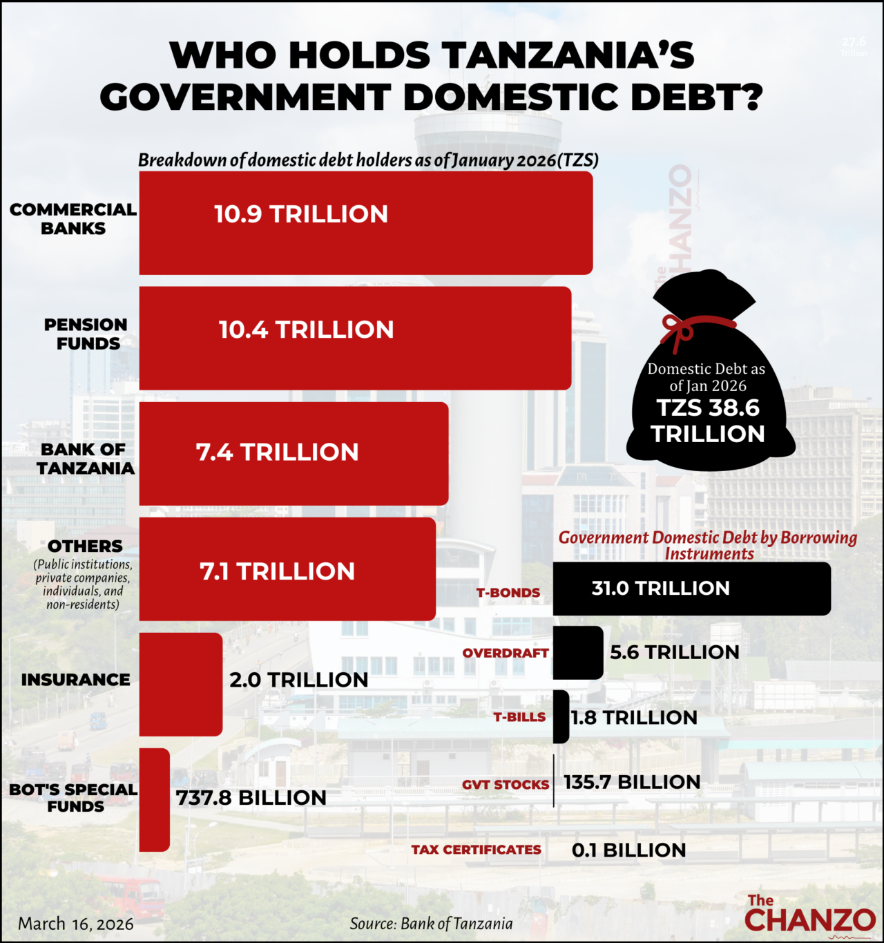 According to the Bank of Tanzania’s Monthly Economic Review for February 2026, the country’s domestic debt stock rose to TZS 38.6 trillion by the end of January 2026, marking a 1.9 percent increase from the previous month.